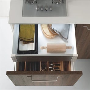 Nevada trasforma ogni spazio operativo in un’area organizzata ad alto valore estetico. Ampia la scelta degli accessori, tra cui anche i led a basso consumo energetico da inserire dentro le basi e sotto i pensili.