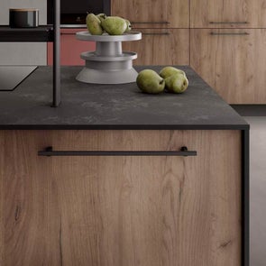 Le essenze materiche del rovere e dell’olmo si mescolano alle finiture lucide e opache. Dal carattere deciso il modello Nevada con le tre tipologie di maniglie.